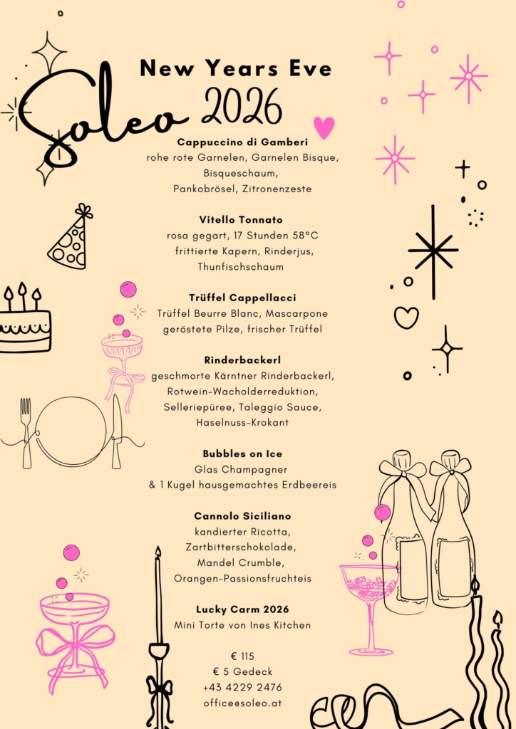 Wir veranstalten am 31. Dezember wieder unser Silvester Gala Dinner mit 7 Gängen. Mit einem Glas Champagner, stoßen wir mit unseren Gästen zu Mitternacht an. Auf eine kleine Überraschung dürfen Sie sich auch freuen.